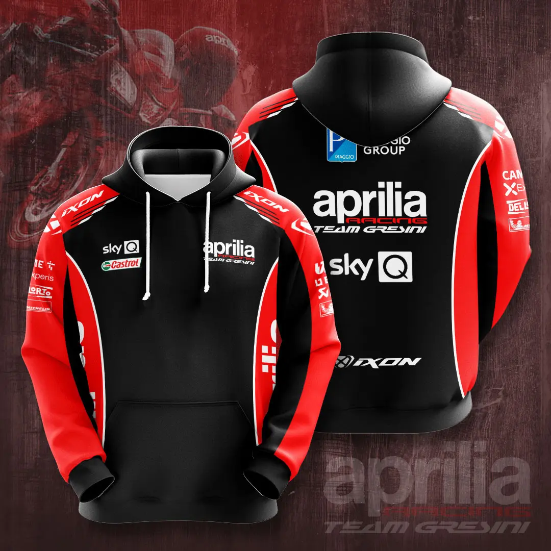 - Aprilia Racing Zip Hoodie: A versatile option with full‑zip closure, ribbed cuffs, and practical pockets. Ideal for layering, it combines sporty function with modern style.