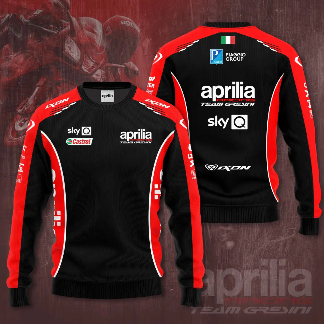 - Aprilia Racing Sweatshirt: Durable cotton‑blend fleece with ribbed hem and cuffs. Minimalist design accented by Aprilia Racing logos makes it a timeless staple.