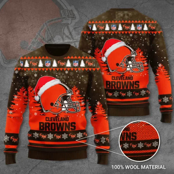 The design features the iconic Cleveland Browns helmet logo surrounded by festive patterns snowflakes, stripes, and bold team colors—rendered in vibrant, fade‑resistant inks. The playful “ugly sweater” aesthetic makes it a conversation starter, while the team branding ensures your fandom shines through.