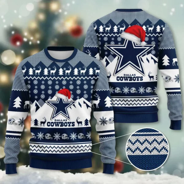 The design celebrates Cowboys heritage with holiday flair. The legendary star logo is prominently displayed, surrounded by playful patterns of snowflakes, reindeer, and bold team colors navy, silver, and white. Depending on the edition, you’ll find oversized graphics, retro‑inspired motifs, or lighthearted designs that balance tradition with festive fun. Each sweater is carefully tailored to capture the energy of the Cowboys while spreading holiday cheer.