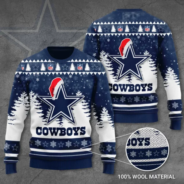 The design celebrates Cowboys heritage with a playful holiday twist. The legendary star logo is prominently displayed, surrounded by snowflakes, reindeer, or bold geometric patterns in team colors navy, silver, and white. Depending on the edition, you’ll find vintage‑inspired motifs, modern graphic prints, or lighthearted designs that balance holiday fun with timeless fandom. Each sweater is carefully tailored to capture the energy of the Cowboys while adding a touch of seasonal joy.