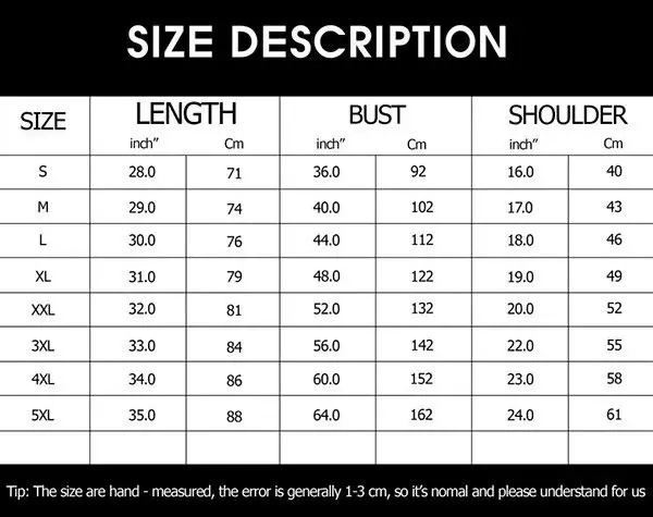 - Size: S, M, L, XL, XXL, 3XL, 4XL, 5XL.