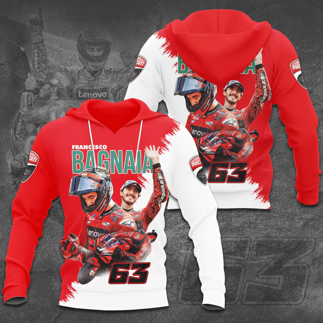 - Francesco Bagnaia Hoodie: Built from cozy cotton‑blend fleece, the hoodie offers warmth and resilience. Featuring an adjustable hood, kangaroo pocket, and ribbed cuffs, it’s practical for cooler days or paddock life. Embroidered logos, sponsor accents, and Bagnaia’s racing number highlight the champion’s identity.
