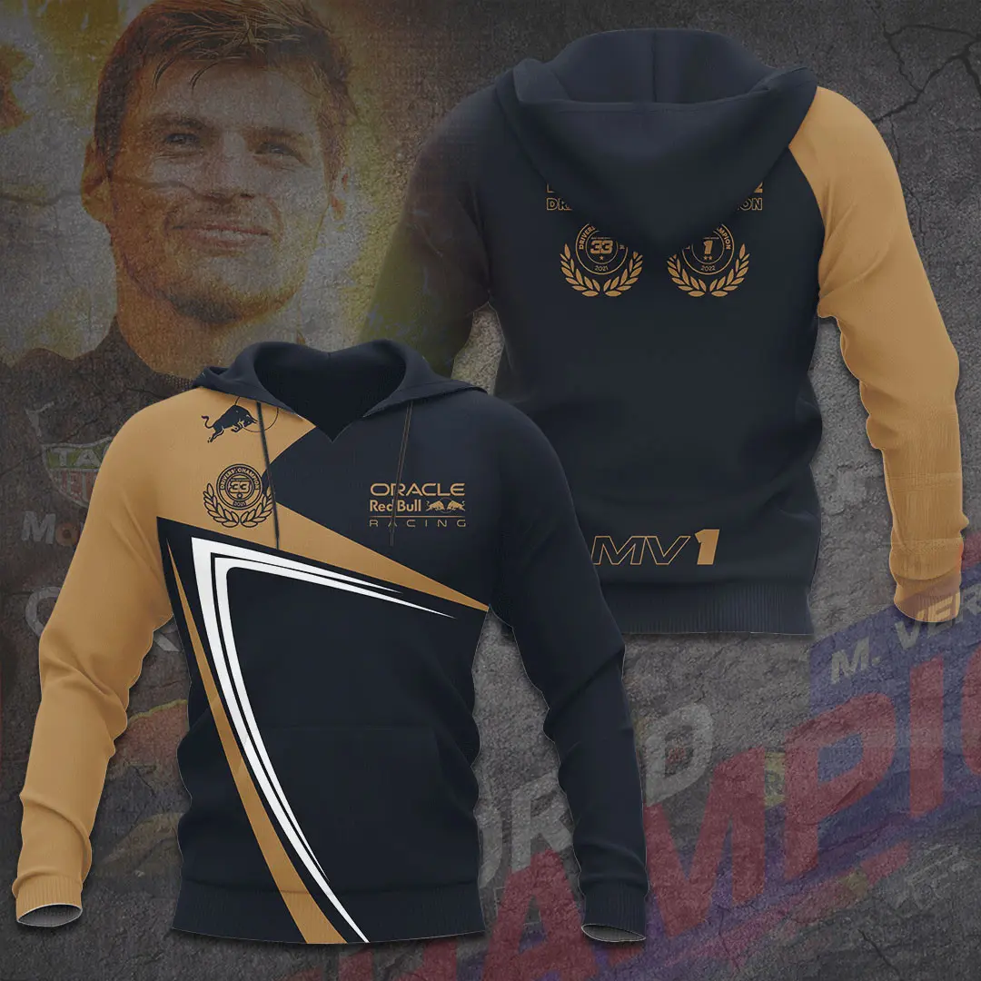 - Hoodies: Cozy, durable designs featuring striking prints that embody Verstappen’s relentless pursuit of victory.