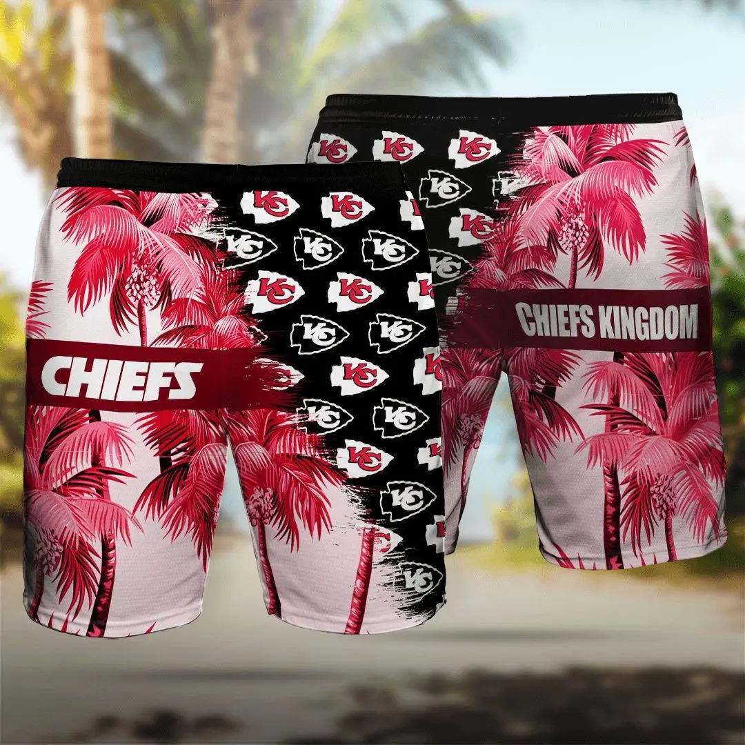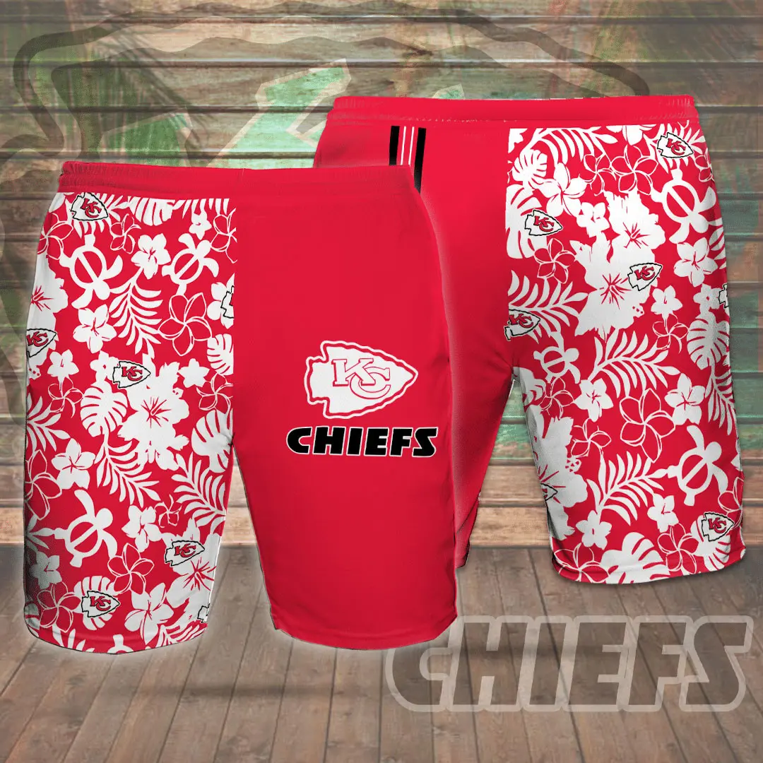 The shirt features a relaxed button‑up design with short sleeves, showcasing bold Chiefs logos and team colors woven into tropical motifs such as palm leaves, hibiscus flowers, or wave patterns. The shorts complement the look with an elastic waistband and roomy fit, ensuring ease of movement and all‑day comfort. Together, they create a coordinated outfit that radiates energy, confidence, and team pride.