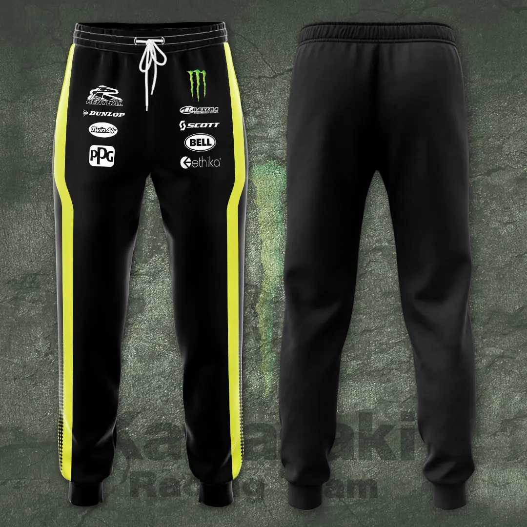 - Kawasaki Racing Team Sweatpant: Soft fleece with tapered legs and elastic waistband. Team logos add a sporty edge, perfect for workouts, travel, or casual wear.