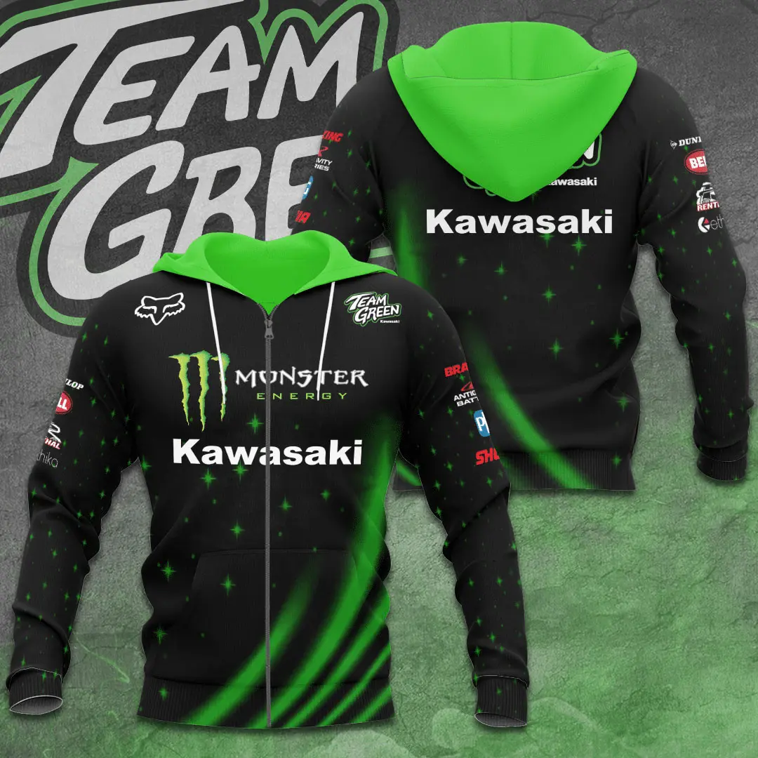 - Monster Energy Sweatshirt: Minimalist yet bold, the sweatshirt delivers warmth with a clean silhouette. Printed or embroidered graphics showcase Kawasaki’s fearless identity.