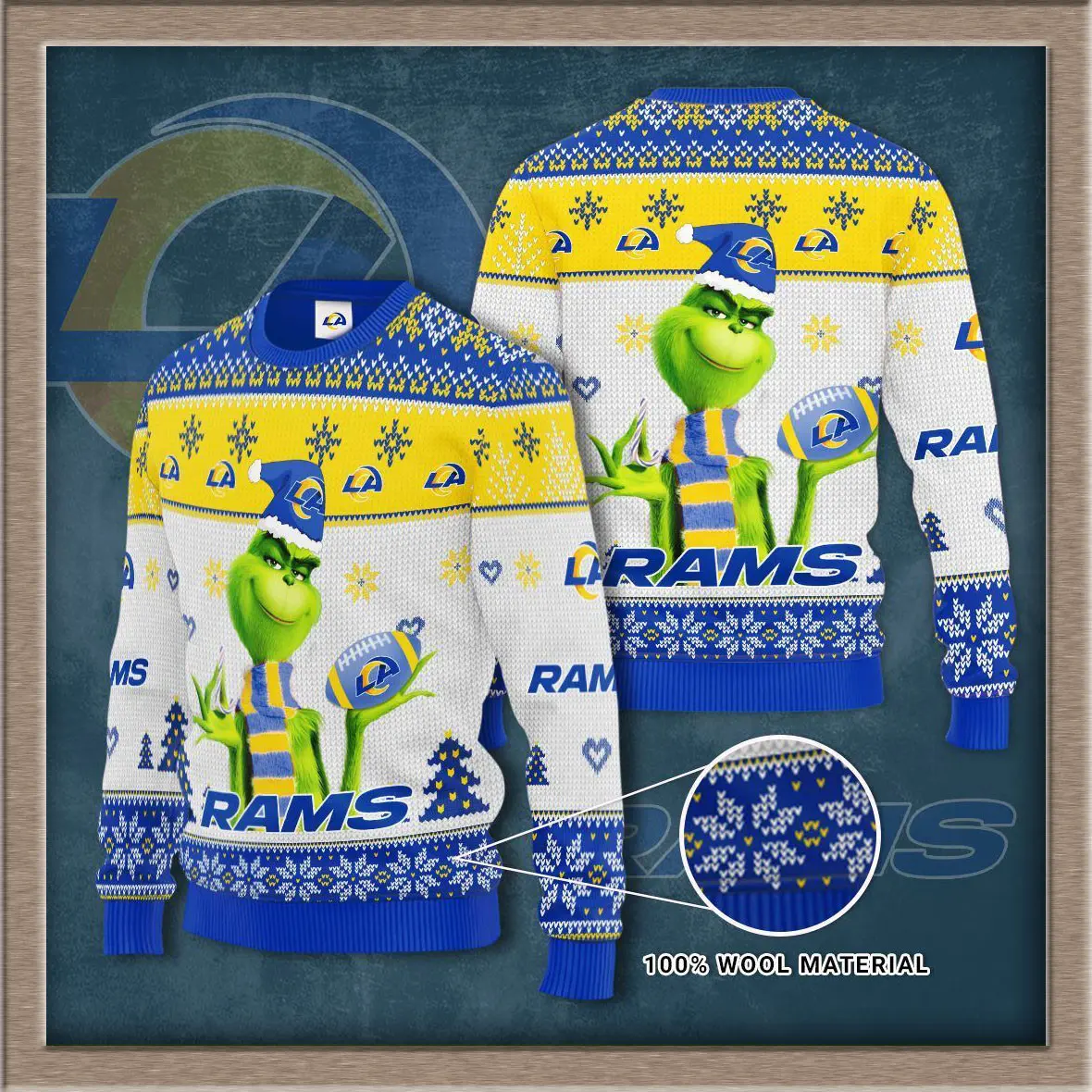 Crafted from premium cotton‑blend or wool‑blend fabric, the Los Angeles Rams sweater offers soft warmth and durability, making it perfect for cool evenings, fall matchups, or casual outings. Its classic crewneck or V‑neck design ensures timeless style, while ribbed cuffs and hem provide a snug finish. Reinforced stitching guarantees resilience season after season, while the breathable knit keeps you comfortable without overheating.