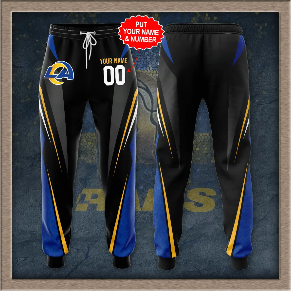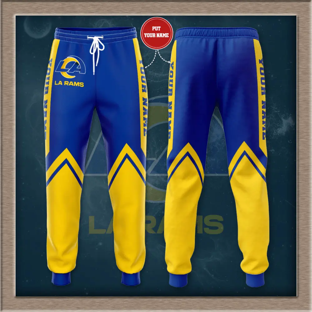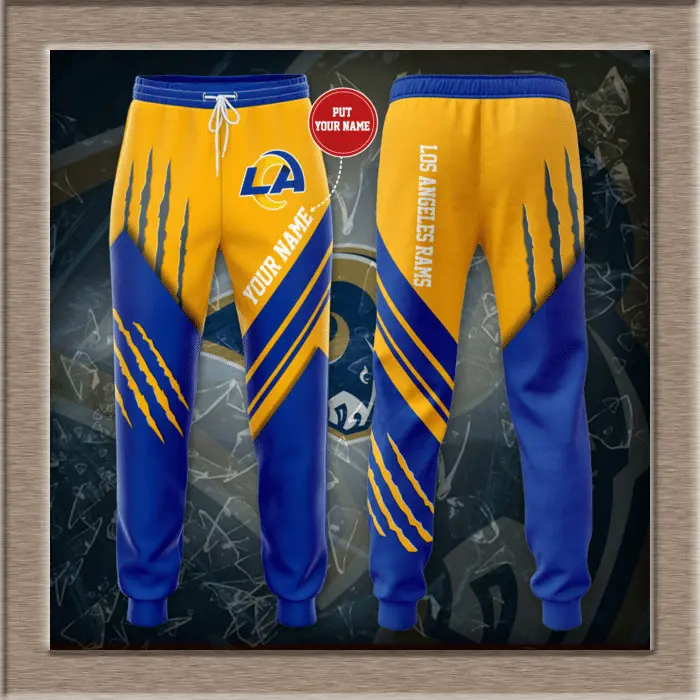 The design highlights the Rams’ iconic royal blue and vibrant gold color scheme, accented by the official team logo printed or embroidered with precision to resist fading. Bold graphics along the leg or hip make a statement, while subtle details—such as contrast stitching or textured finishes—add depth and flair. Whether paired with a hoodie, T‑shirt, or jersey, these sweatpants deliver a look that transitions seamlessly from stadium stands to city streets.
