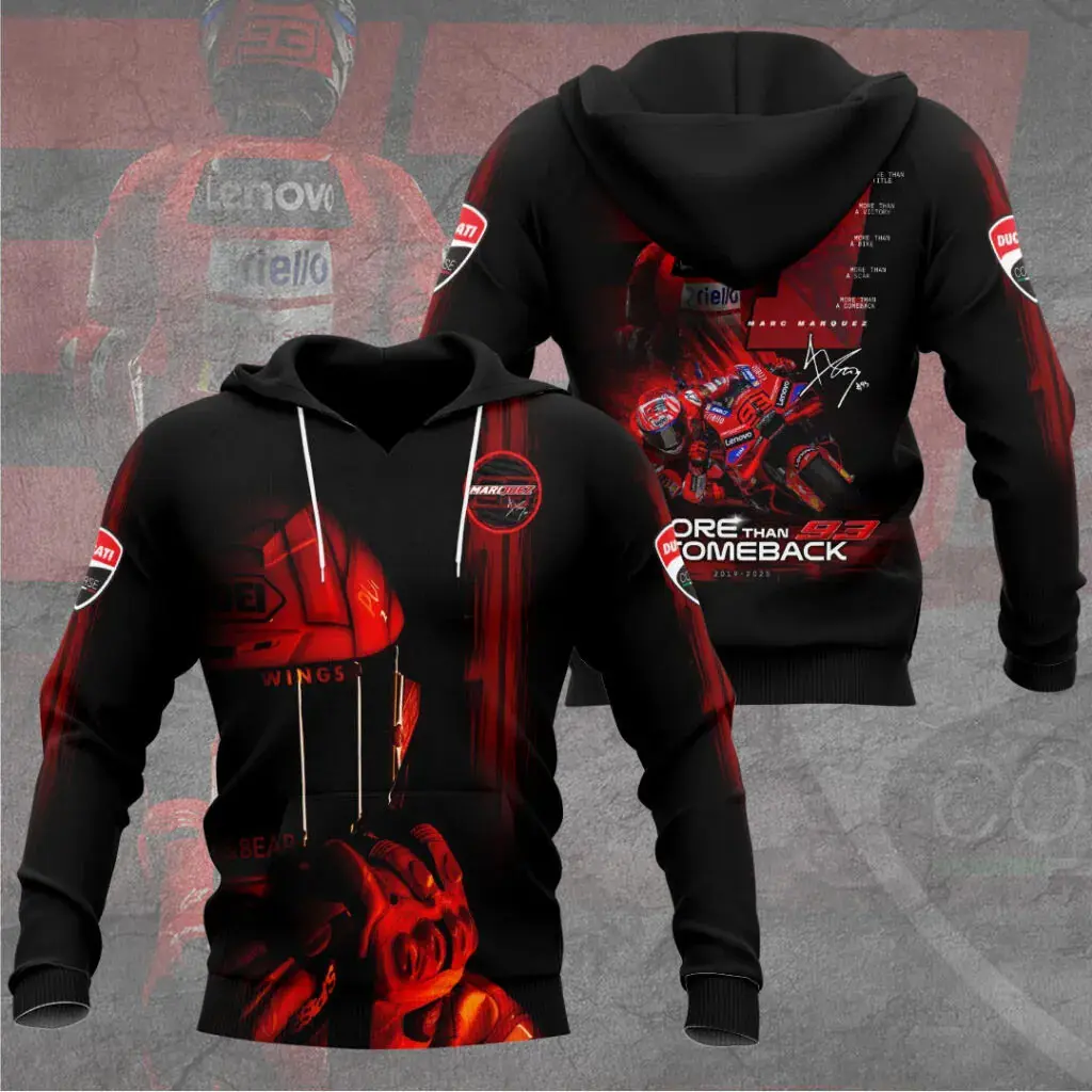 - Marc Márquez Hoodie: Built from cozy cotton‑blend fleece, the hoodie offers warmth and resilience. Featuring an adjustable hood, kangaroo pocket, and ribbed cuffs, it’s practical for cooler days or paddock life. Embroidered logos, sponsor accents, and Márquez’s signature branding highlight his champion’s identity.
