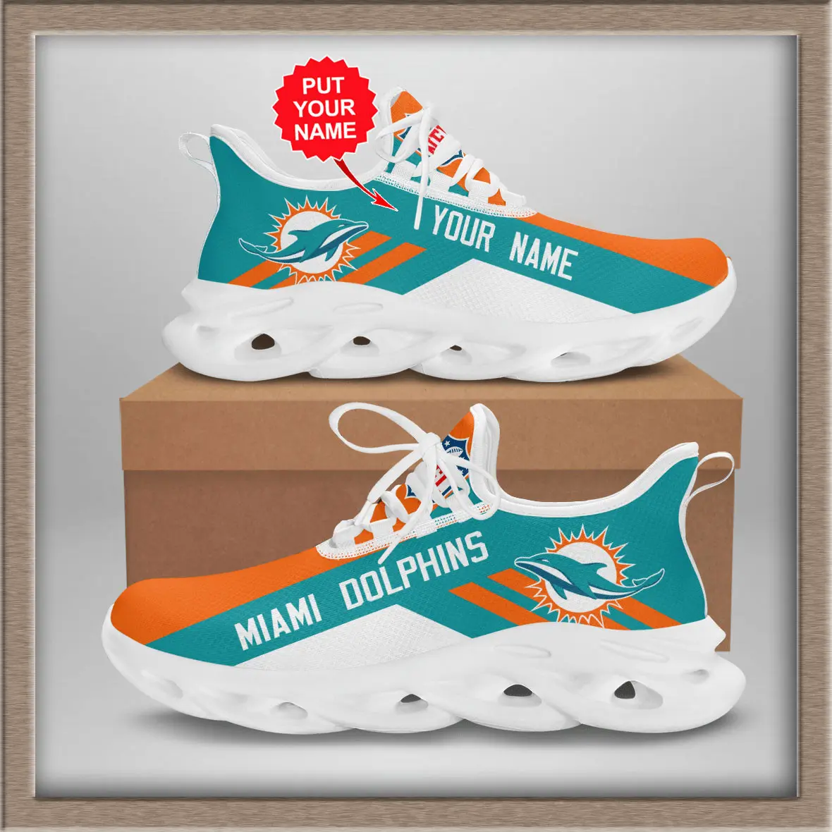 The design highlights the Dolphins’ iconic aqua and orange color scheme, accented by the official team logo printed or embroidered with precision. Some versions feature bold graphics across the sides, while others keep it subtle with a small logo near the heel, offering options for every fan’s taste. Sleek lines and modern styling make the sneaker easy to pair with jeans, joggers, or shorts, giving you a look that transitions seamlessly from stadium to street.