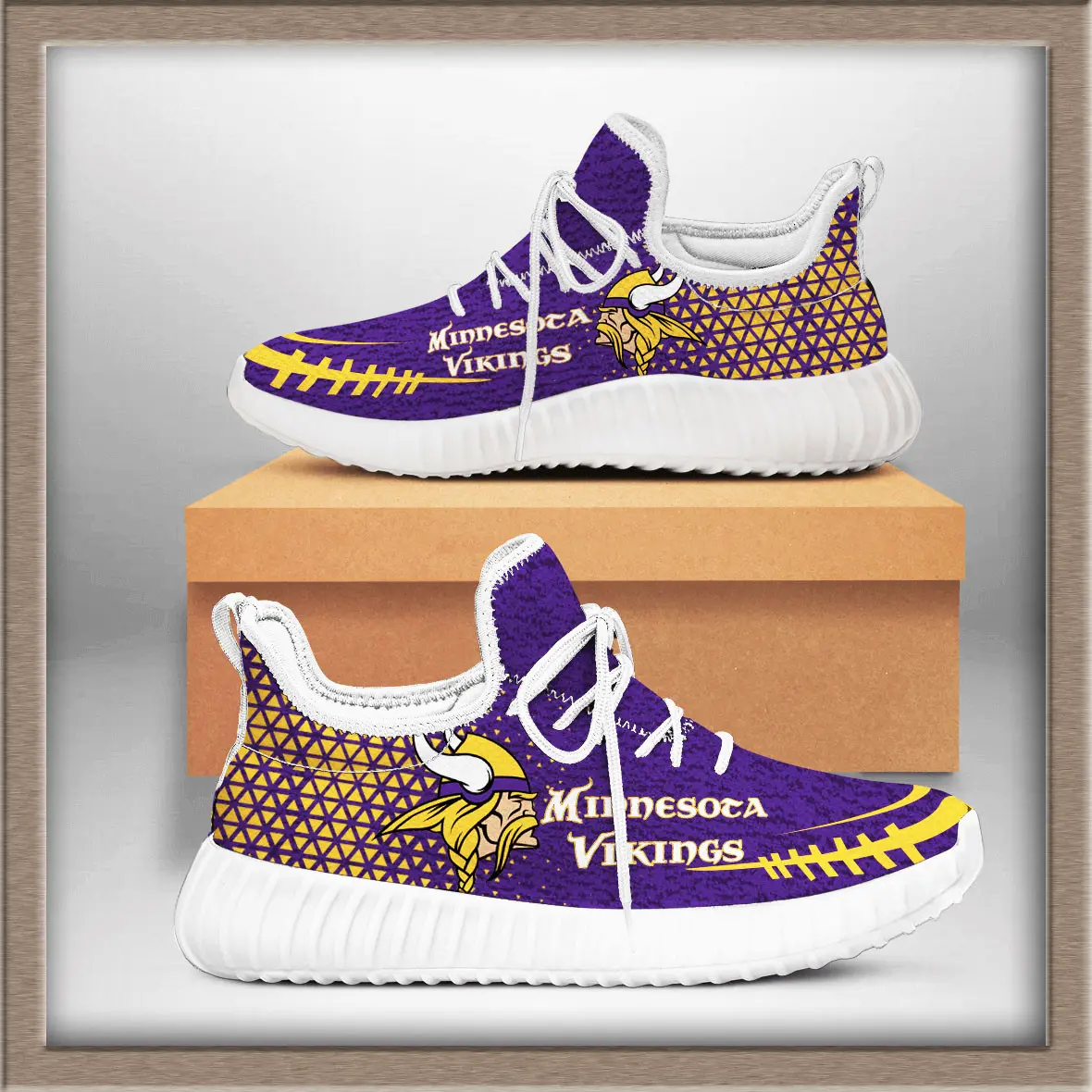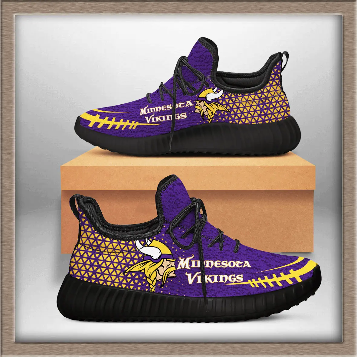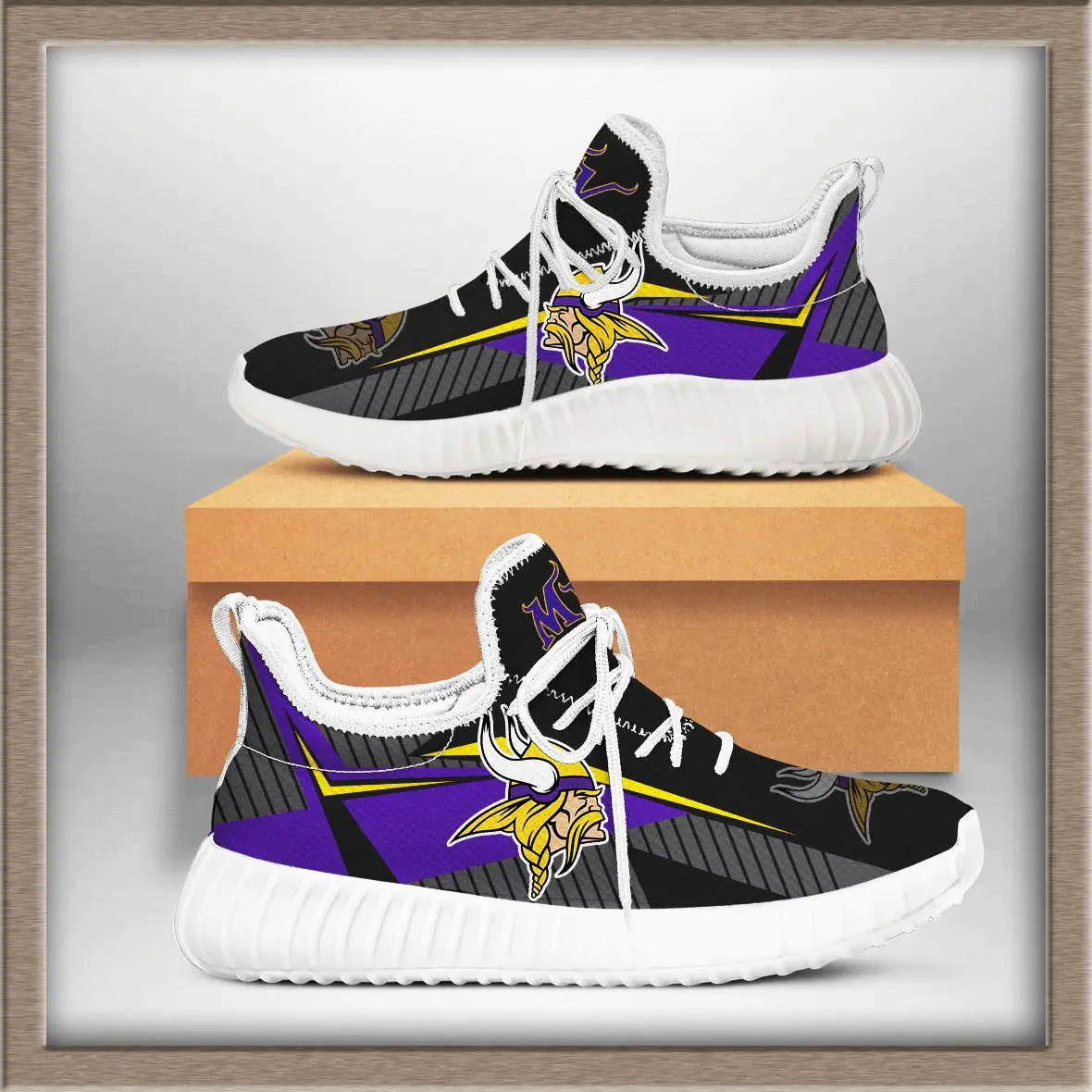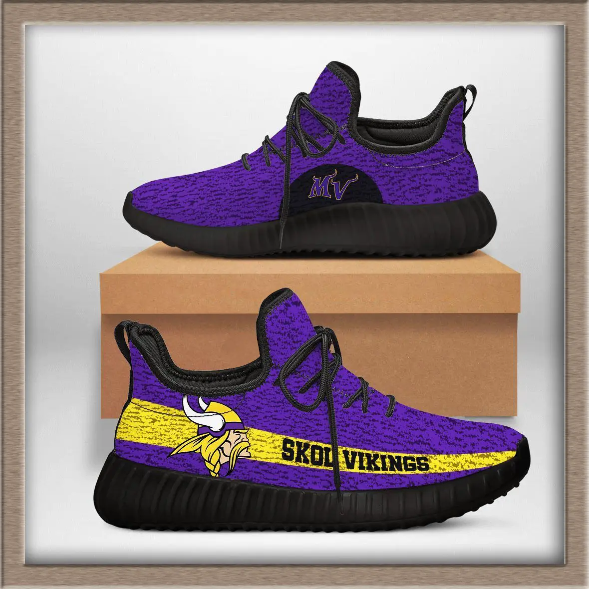 - Design: Sleek Yeezy‑inspired silhouette with Vikings logo and team colors.