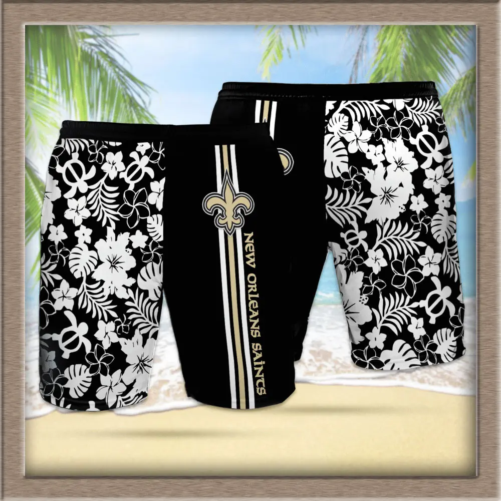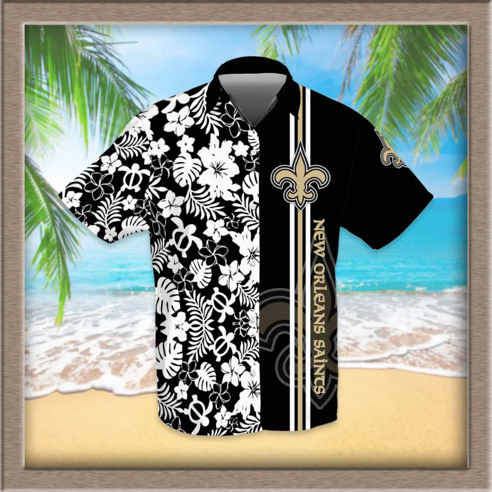 - Design: Vibrant Hawaiian prints featuring the New Orleans Saints logo, team colors, and tropical motifs.
