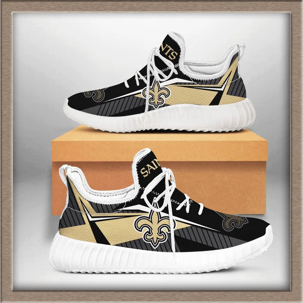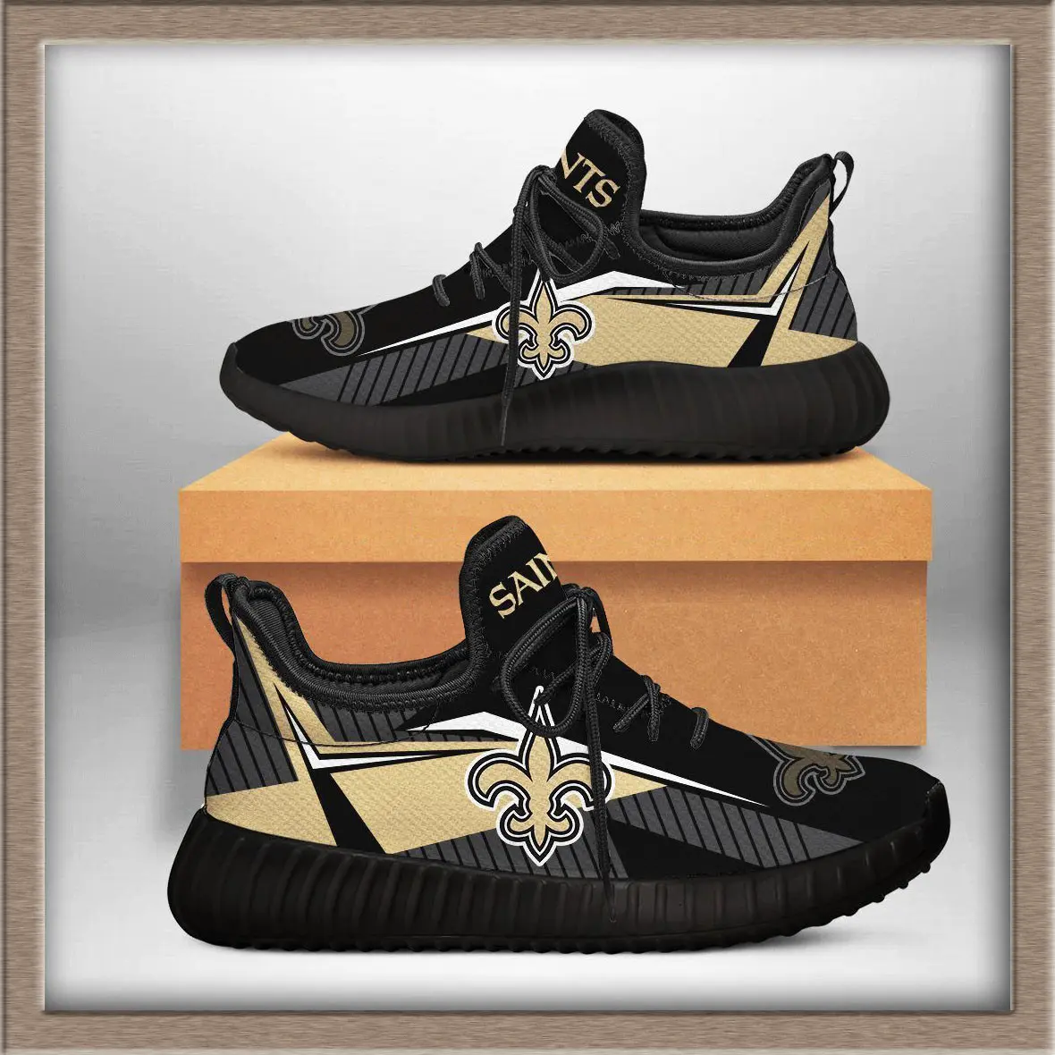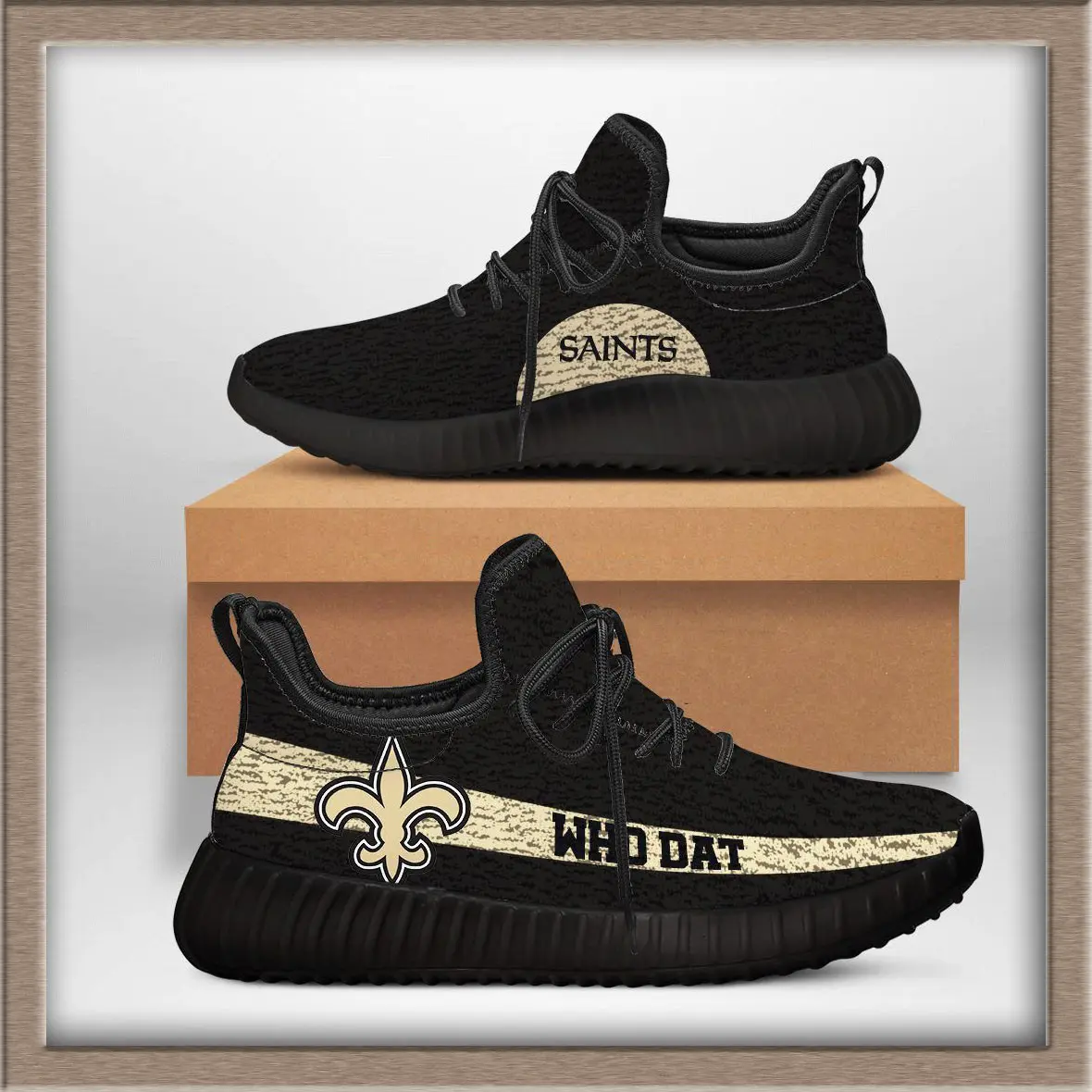 The New Orleans Saints Yeezy sneakers are a unique fusion of streetwear style and NFL fandom. Inspired by the iconic Yeezy silhouette, these shoes bring the bold black‑and‑gold colors of the Saints into a modern sneaker design. The upper is typically crafted from breathable knit material, giving a lightweight feel, while the chunky sole provides comfort and durability for everyday wear.