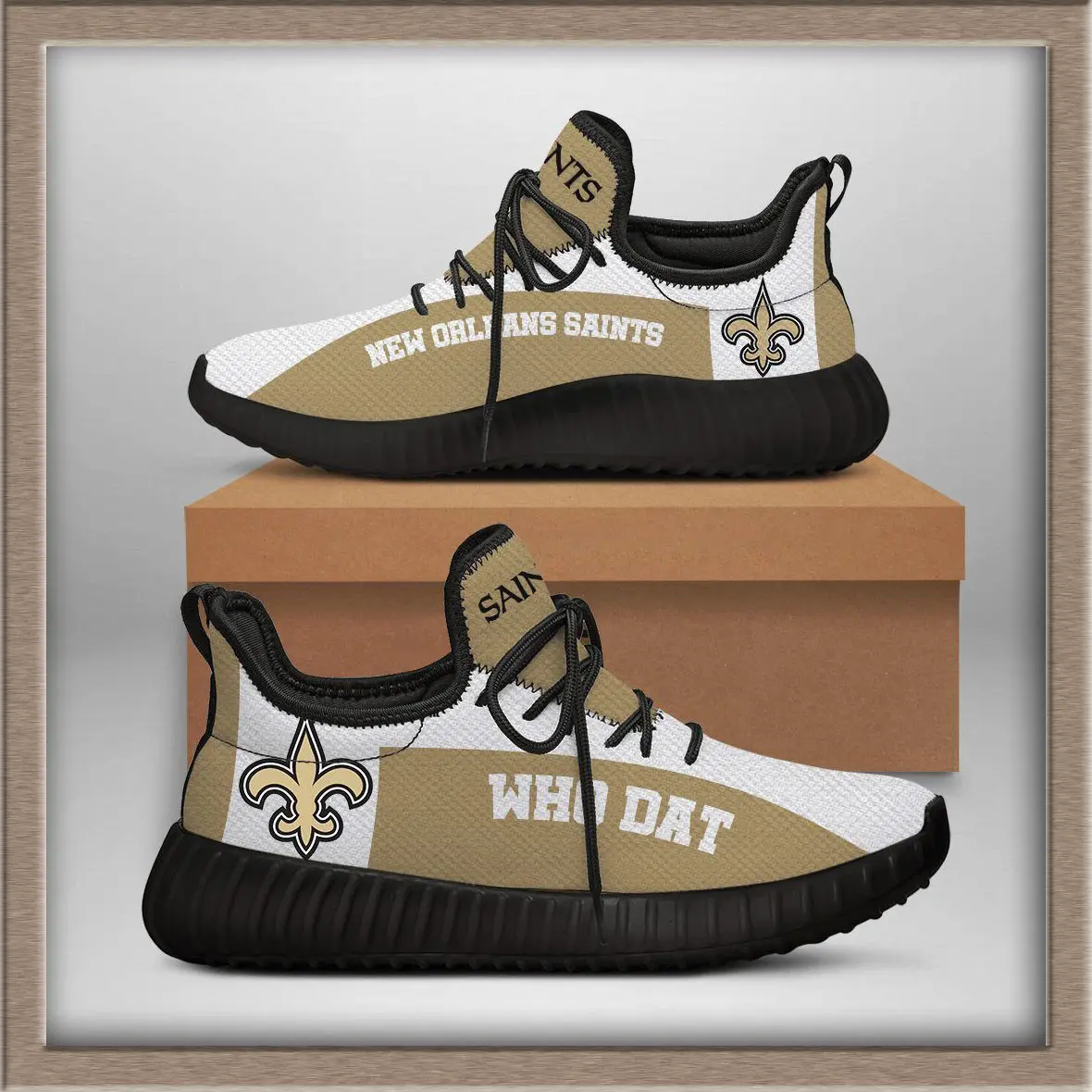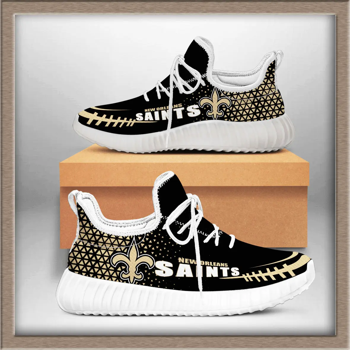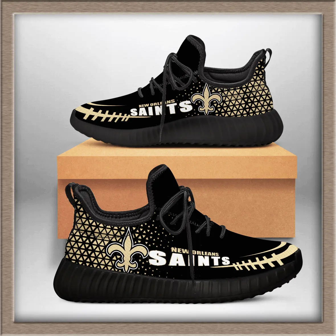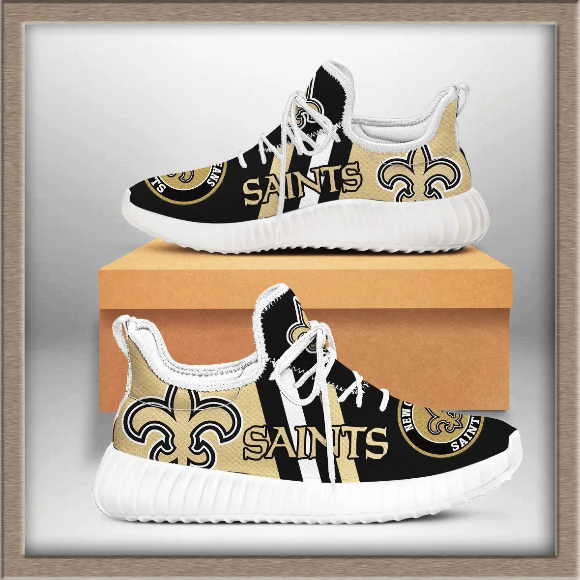 The New Orleans Saints Yeezy sneakers are a unique fusion of streetwear style and NFL fandom. Inspired by the iconic Yeezy silhouette, these shoes bring the bold black‑and‑gold colors of the Saints into a modern sneaker design. The upper is typically crafted from breathable knit material, giving a lightweight feel, while the chunky sole provides comfort and durability for everyday wear.