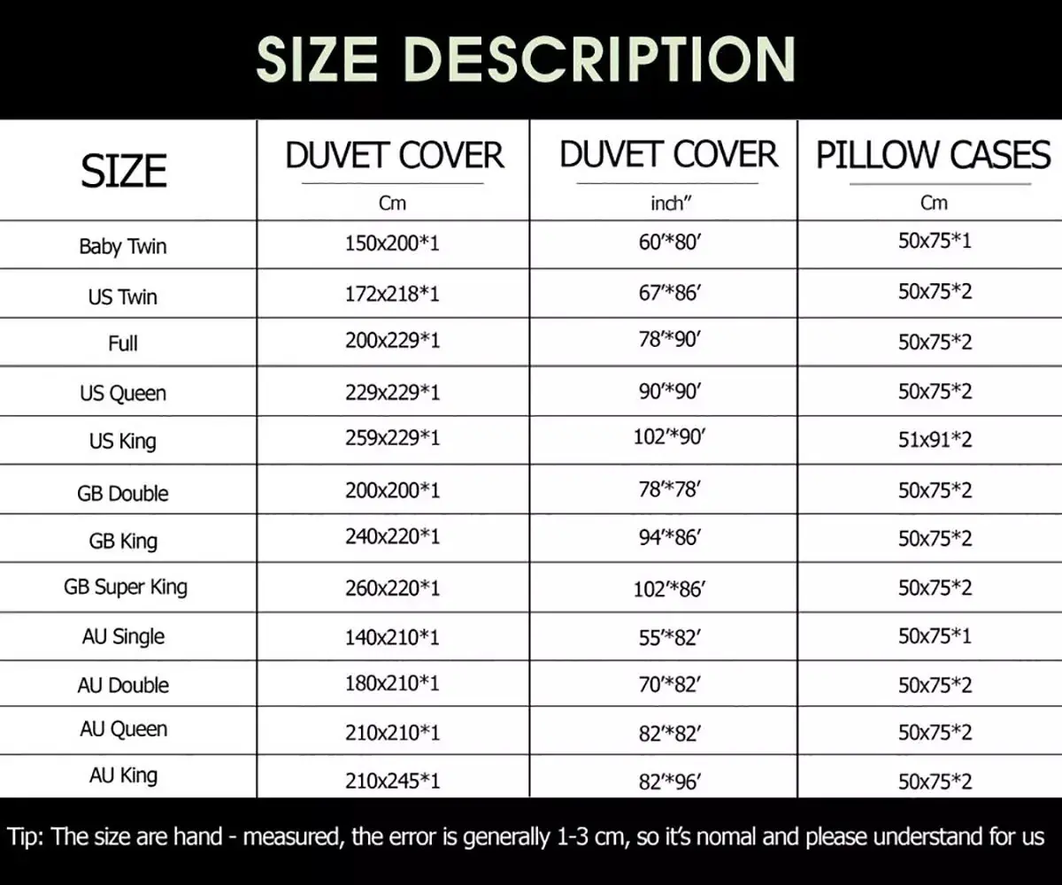 Size: Baby Twin, US Twin, Full, US Queen, US King, GB Double, GB King, GB Super King, AU Single, AU Double, AU Queen, AU King