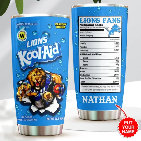 The design celebrates Lions heritage with bold Honolulu blue and silver accents, official logos, and graphics inspired by authentic game‑day gear. What makes it special is the personalization: add your name, initials, or a custom message to make the tumbler truly yours.