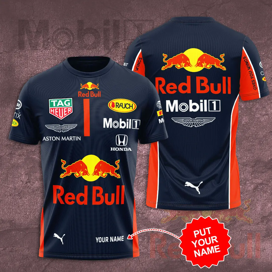 - Personalized Red Bull Racing F1 T-Shirt: Lightweight and versatile. Featuring team visuals, customizable with your own text or initials—perfect for race day or casual wear.
